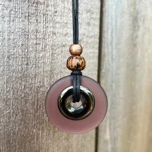 This Hematite and Cultured Sea Glass pendant is handcrafted by my husband and I. We use high quality gemstones and slabs in all our pieces. It has an adjustable waxed cotton cord so it can accommodate most outfits!