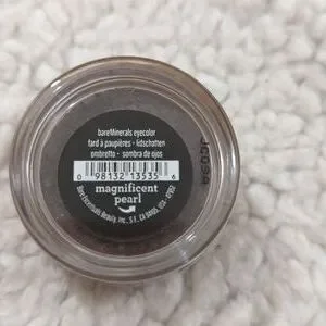 Bare Minerals "Magnificent Pearl" eye color is a deep pearly taupe or charcoal taupe shade with a shimmering finish. Descriptions vary slightly, with some sources noting it as a charcoal taupe and others specifying it as a deep pearly taupe with a hint of mauve.