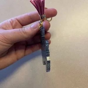 The keychain contains grey glitter