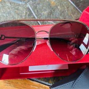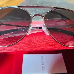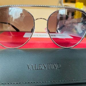 Never worn Valentino sunglasses. 57mm aviator style , gunmetal gradient black with jeweled detail on top. Has box, all cards and protective case and bag.
