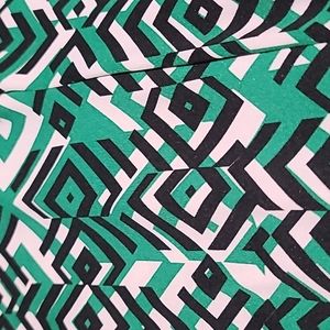 Green, white, and black pattern 1 piece jumpsuit. stretchy fabric, has tie waist belt. V neck. Tag says PXL. fits size 10 to 12.