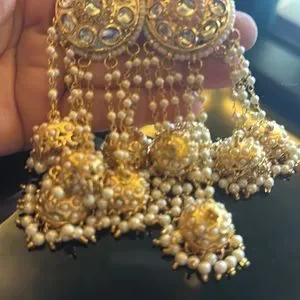 A made to order, customised pair of ‘Jhumka’ earrings with 4 Jhumka’s suspended on delicate strings of faux pearls with kundan in a gold finish ! Made to order piece ! Not available in the market ! Stunningly gorgeous yet very light weight and comfortable !