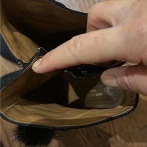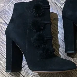Aquazzura black suede booties embellished her with 4 mink Pom Pom’s, in very good condition, side zipper, 4.5 inches heels, original packaging ( box, dust bag, and authentication) card not available.