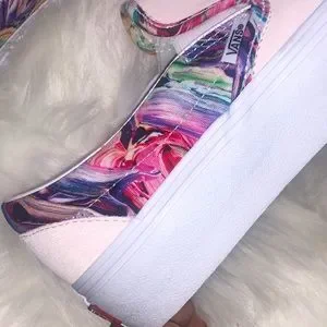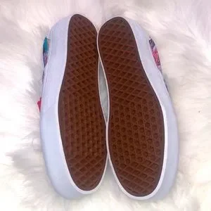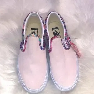 Brand new. Never been worn. Custom made Vans. Top material is suede and light pink colored. These Vans are platforms. Carrying bag included!