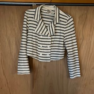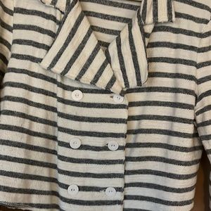 Cropped cream and gray raglan jacket. Two columns of buttons.