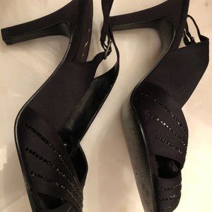 Black, open toe, sling back shoes, with small black sequence embellments. Worn once.