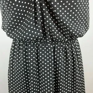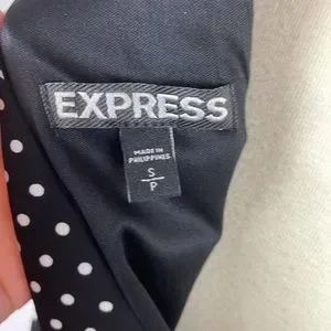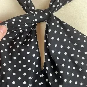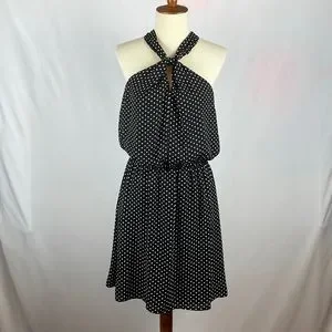Absolutely gorgeous! EUC. Black, with white polka dots, halter dress from Express. Sexy keyhole under knot in front. Tie in back of neck creates back keyhole as well. Dress is fully lined and has elastic at the waist. Top blouses over. Lightweight fabric doesn’t stretch. Sexy and flattering fit. Wear it to the office with a blazer, or to the club with black heels. Size Small.