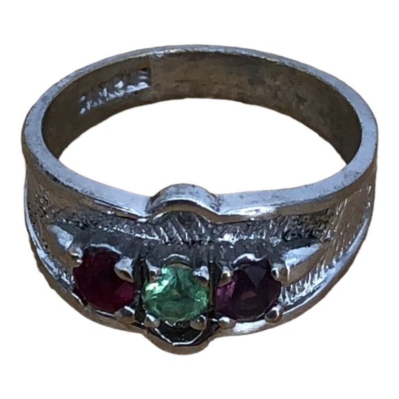 Three gemstone silver ring with 2 dark red and one light green stones 6.5