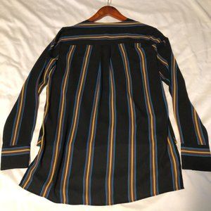 Oversized BCBG blouse, size xxs but sized big. I am normally an extra small and this was still big on me. Long sleeve, hi/low style where the front stops at the waist and the back is longer. While all one piece, it looks like a camisole with a blouse over it.