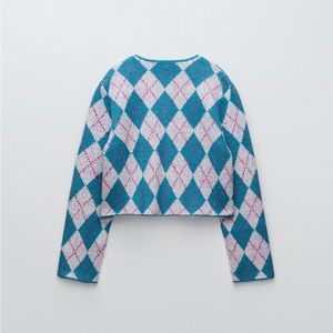 Zara knit jacquard cardigan with argyle pattern. Round neck and front button closure. Two front patch pockets.