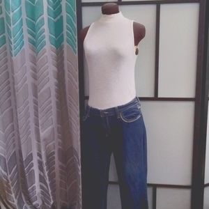 jeans are 524 Levi's brand and too super low styling from 524. boot cut blue medium wash. very lightly worn. size 10 I'm guessing measure is 36 inches around 48 length pant leg. tan top is tight fitting large from ambiance. You can buy together or separately