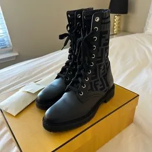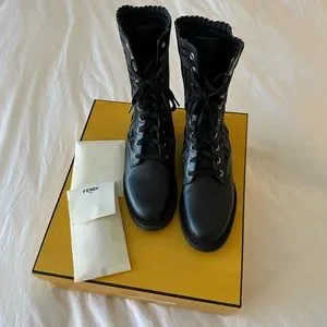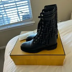 Fendi Rockoko Black leather biker boots with stretch fabric size 36.5
