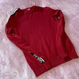 Burgundy Guess Sweater | Crew Neckline | “Guess” Logo along the Arms | Material: Rayon | Size: Small