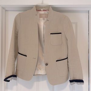 Business casual blazer from Banana Republic. Silk inseams with a nautical stripe. Single front buttons with front pockets. Woven khaki color. Only worn once.