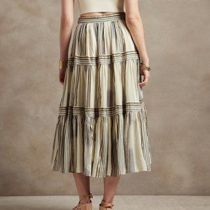 Adorned romance, this flowing midi skirt is crafted from a blend of sumptuous cotton that cascades with delicate shirring and bands of shimmering gold lurex threads that sparkle even in moonlight. Sold out everywhere.
