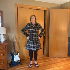Size medium wool-blend coat in timeless plaid. Double breasted with black buttons and belting detail. Some fuzz/pulling as shown but it looks great. Mom in photo is size 10/sometimes 12
