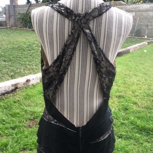 Preloved, Excellent Like New Condition Stunning BEBE layered with satin and lace dress. Sexy Low cut front and low crossed back.