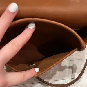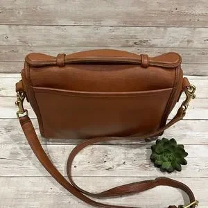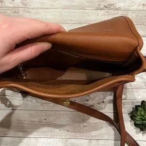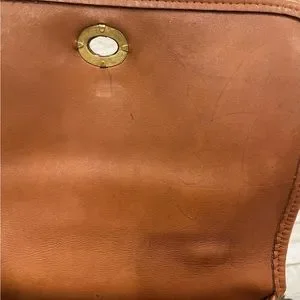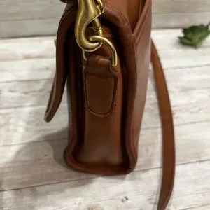 Beautiful camel color leather coach with gold turn lock.