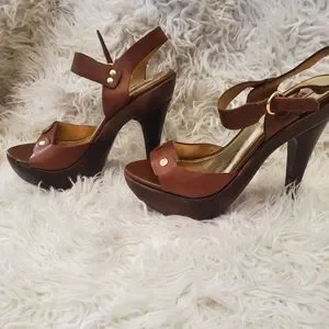 brown real leather sandals with gold hardware, wooden stiletto heel, platform sandals, barely worn but some bumps and bruises on leather and wood. can be fixed easily with wood pen filler or sharpie. super cute, sz 7 fits like a 7.