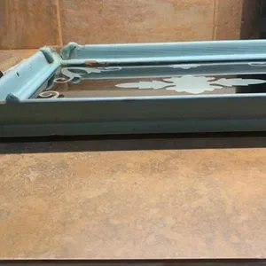 Unique vintage serving tray glass with wood frame and metal legs 18 x11.5” 1.5” depth
