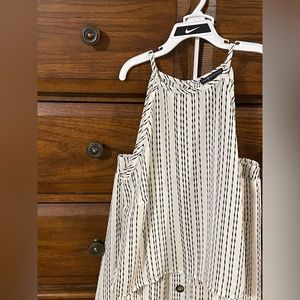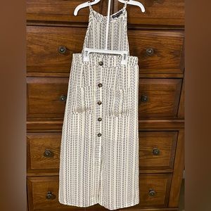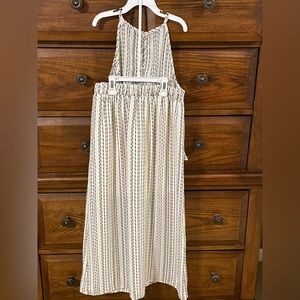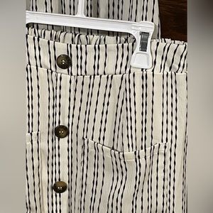 Never worn. Straps do not adjust on the top.. it has button in the back of neck. Skirt is midi length and has elastic waist with pockets and non functional buttons in front. Skirt is half lined with attached mini slip. Color is crème with black design. Size XS.