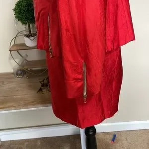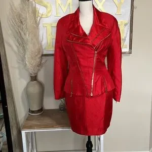 Rare vintage bright red Cache skirt suit.๐ฅ Signature cinched, wasp corset waist + exaggerated power shoulder pads. Features incredible fully functional gold hardware zipper details throughout bodice and crinkle effect fabric. Fully lined with diagonal front zip and hidden interior button closure. Skirt has invisible back zip. No flaws. Very punk rock, metal, goth, vamp, perfect for stage wear or special occasion with a bustier or band tee top