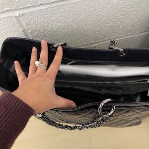 This bag is almost in new condition. Interior lining is silk or satin. No sign of tear or stain. If you are busy career woman on the go and still fashionably stylish and minimalist, this is your bag. Casual but chic and day to night transformation with this beautiful iconic and timeless Chanel bag. Minor wear but no sign of tear. Color is almost black but it's blue. include removeable center pouch and authentic card