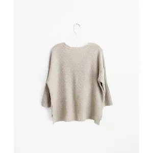 NY Collection Beige 3/4 Sleeve Sweater size Extra Large, gently used--no rips, stains, or holes; a few snags throughout, made in USA, v-neck, dropped shoulder seams, 3/4 sleeves, boxy cut, straight high-low hem longer in back, diamond pattern in body knit with open knit stitches at intersections, ribbed knit sleeves and hem, oatmeal beige knit self, 100% acrylic, 24.25" across shoulders, 24" pit to pit, 22" shoulder to hem, 12.5" sleeve, 22" shoulder to hem