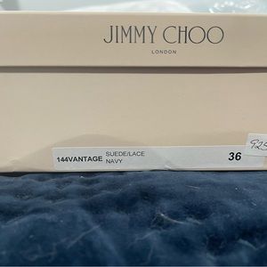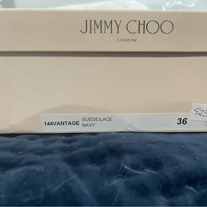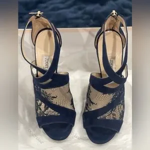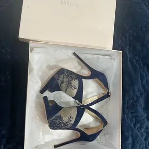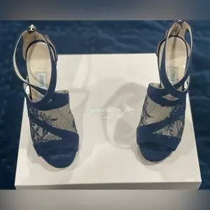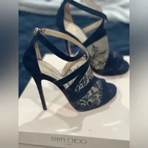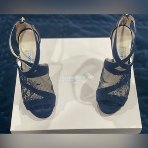 Jimmy Choo 144Vantage Suede Lace inset glove sandal in Navy 4” peep toe heels with zip up back. Worn 2x only wear located on back of heel barely can be seen and on bottom leather of the shoe as shown in pictures. Stored in original box with Jimmy Choo tissue paper.