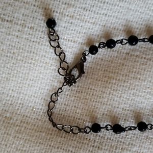 This is such a pretty black stone necklace. It has a faceted stone hanging from a double chain. The chain on the necklace is lined with black stones of increasing size to the pendant.