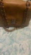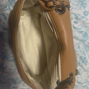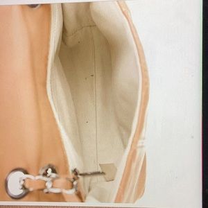 Beige canvas lining, single zip pocket inside, wall, and magnetic snap closure it has a serial number inside.