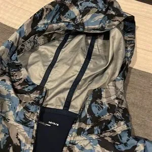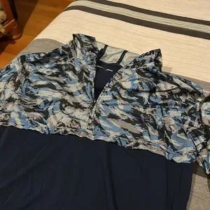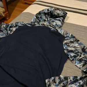 This under armor pull over has a half zip nylon top printed with a hood, and the bottom is navy soft cotton.great condition