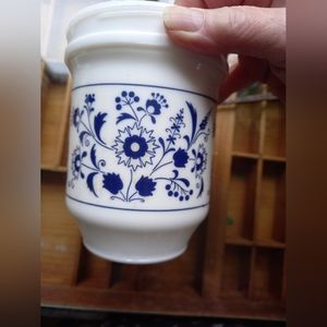 Vintage kitsch Milk Glass Blue Botanical floral pattern Mustard jar