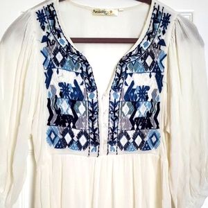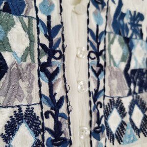 Gorgeous white tunic top with detailed blue embroidered front and button closure