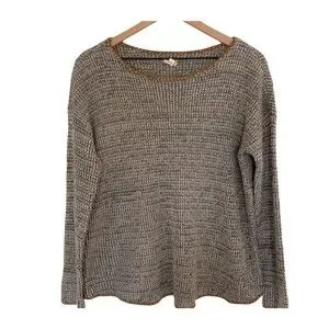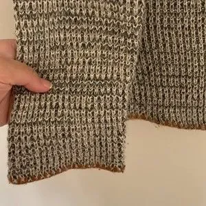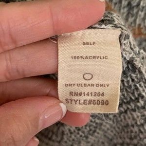 Color: Grey, white and cream with brown trim along neckline, hem, and sleeves.