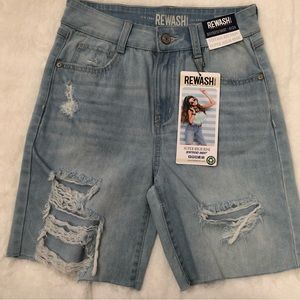 REWASH NWT Size 24 super high-rise boyfriend vintage reunion short distressed style raw hem, material has stretch and the color is a light denim. Please see Photographs for measurements as item was laid flat and measured. Material tags are in photographs as well. This item was purchased from the juniors department.