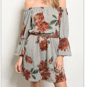 Grey Floral Off The Shoulder Dress. Gorgeous transition piece. Slightly heavier feel. Long sleeves that bell out just below the elbow. Elastic waistband, with belt included. 96 polyester 4 spandex. New boutique item.