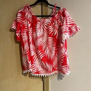 Women 2X SHEIN Playful Flirty PomPom Off Shoulder Ruffle Sleeve Blouse- Babydoll style top with ruffle flare shirt sleeves, elastic neckline can be worn on or off shoulders, tie straps for shoulders, fern print- 26 inches from armpit to armpit and 26 inches from shoulder top to bottom- excellent new condition