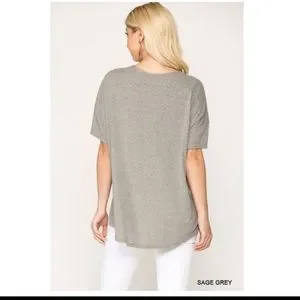 CAMOUFLAGE PRINT CENTER KNIT TOP WITH HIGH-LOW HEM. - COLOR: SAGE GREY NEW.
