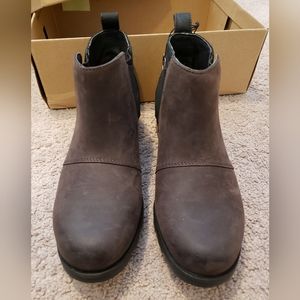 Sorel Emelie Chelsea Blackened Brown Boots - New/Never worn, Size 6.5, Blackened Brown color, no original box. I am typically a size 7 and these fit comfortably when trying on for size but cannot comment on long term. With that said, these Sorel distressed pull on ankle booties are very attractive and I love the leather and lower heel look!