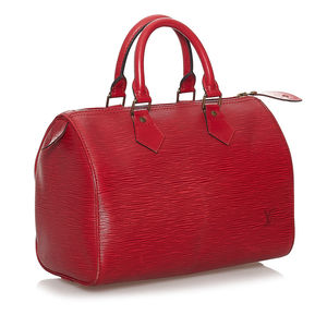 The Speedy 25 features an epi leather body, an exterior side slip pocket, rolled handles, a top zip closure, and an interior slip pocket.