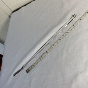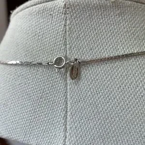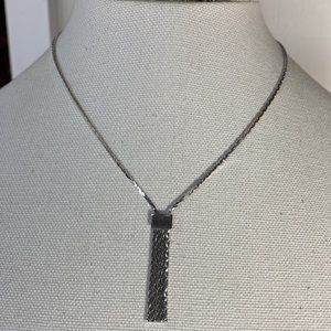 Here is an older Avon necklace from from my aunties collection. This silvertone necklace is very feminine and has an interesting dangle feature at the end of the front of the necklace. The same type chains as in the necklace dangle from a flat small rectangle. Perfect for those that prefer a smaller style of necklace.