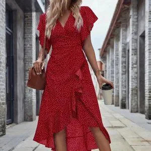 Red Preppy Womens Polka Dot Ruffle Trim Knot Side Wrap Dress