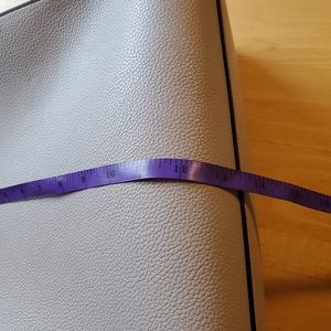 Beautiful Calvin Klein hand bag in a silver color light tan color. It's in excellent condition the only markings I can see is inside the bag from like pen markings. See 3rd from the last pictures. The last 2 photos are approximate measurements. No other markings that I can see.