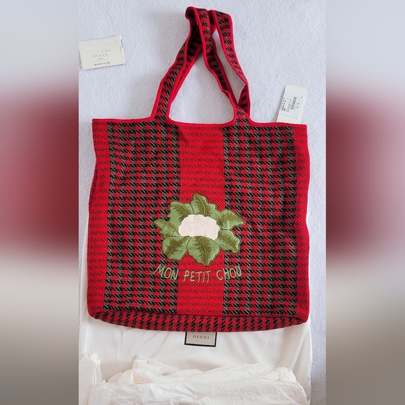 Cauliflower embroidered houndstooth tote bag from gucci . Made from wool, this roomy accessory has been embroidered with the words ‘Mon Petit Chou’—a French expression of endearment meaning 'my little cabbage'. Our thoughts exactly.