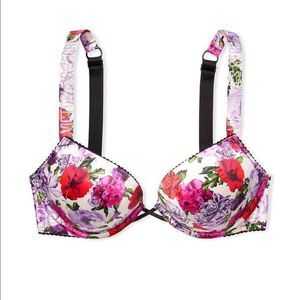 •VICTORIA’S SECRET•NWT bombshell smooth shine strip floral bra size 32D… the highest-lifting push-up is enhanced with rhinestone straps and satin cups in a vintage-inspired floral print. Soft padding helps you go bold without sacrificing comfort. Lift & Lining Maximum lift (adds 2 cup sizes)…Underwire, Adjustable straps, Back hook-and-eye closure…Rhinestone logo shine strap