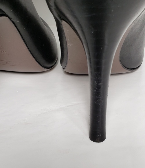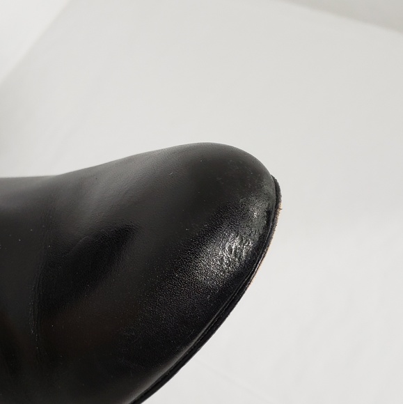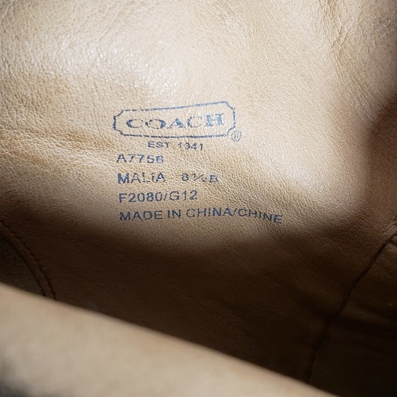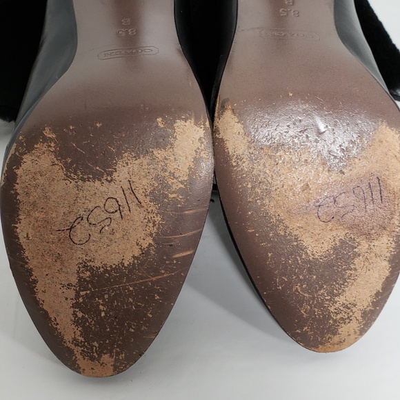coach malia bootie black, genuine shearling ( Australia) upper/ leather lining and sole, approximate heel height 4" 3 /3/4 shaft cuff uncuffed 6" , some wear on toe and on heal both shown in pictures. used great condition size 8.5
