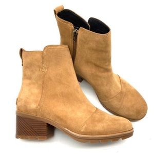 Like new, Cate booties. Beautiful camel waterproof suede in a classic Chelsea with side zipper for easy on-off. Nice chunky heel, approx 2”h, and lug sole.