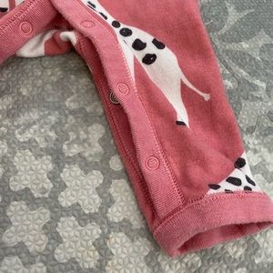 Tea Collection, cap sleeve baby romper. Size 0-3 months. Coral pink with white giraffes. 100% cotton, snap opening at the bottom. Good condition.