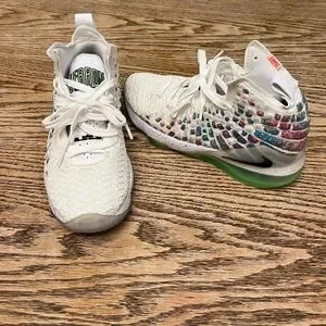 Kid’s Nike Lebron size 5 basketball shoes. White with multicolor. Used.